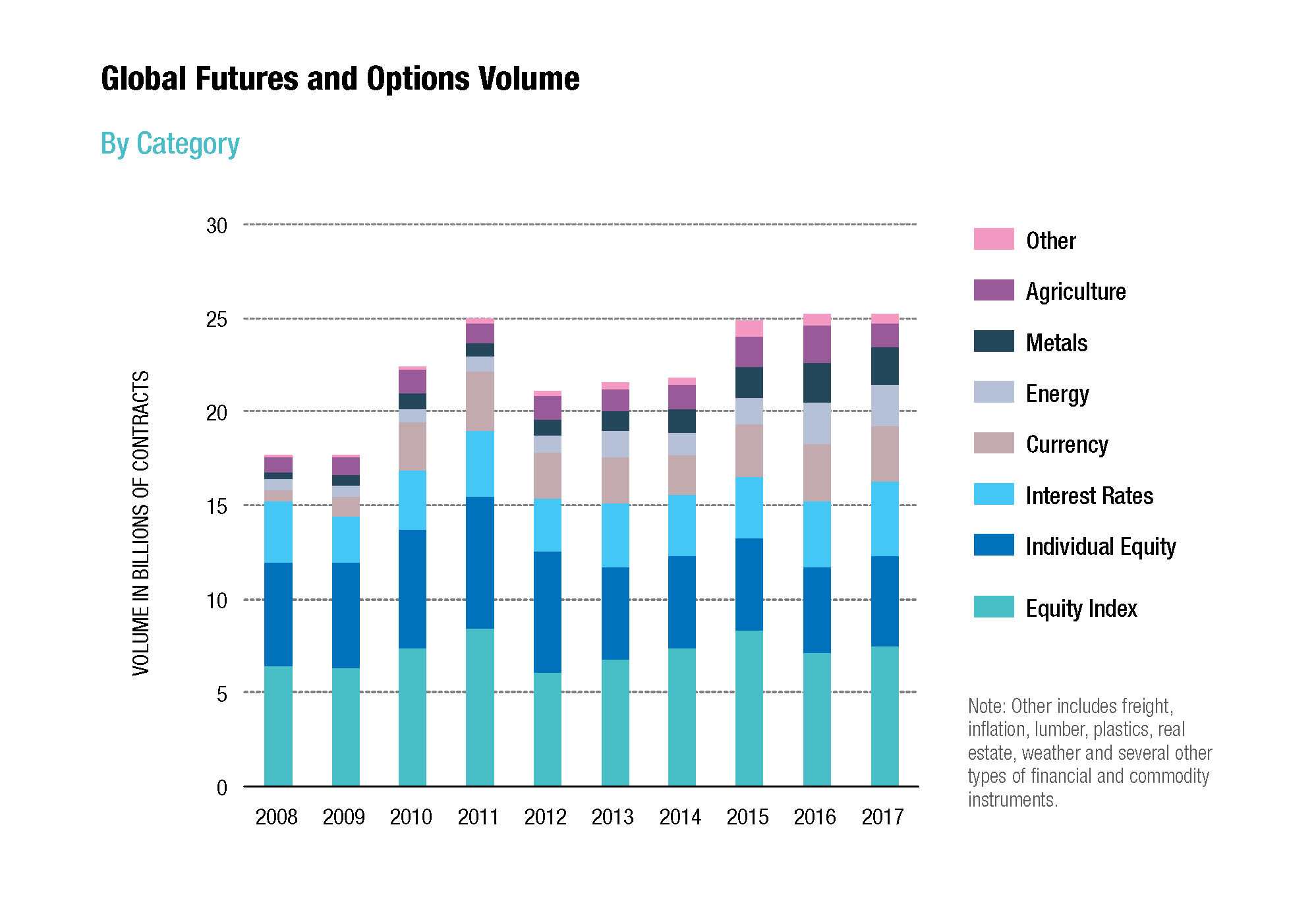 Total worldwide volume in 2017 was 25.2 billion contracts, which was down 0.1% from the prior year. The total number of futures traded on exchanges fell 6.6%, while total options volume rose 11%. In terms of categories, the trading of financial futures and options rose while trading of commodity futures and options fell. The interest rate category rose the most, with volume up 12.9% to 3.97 billion contracts. The agricultural category declined the most, down 32.4% to 1.31 billion contracts.