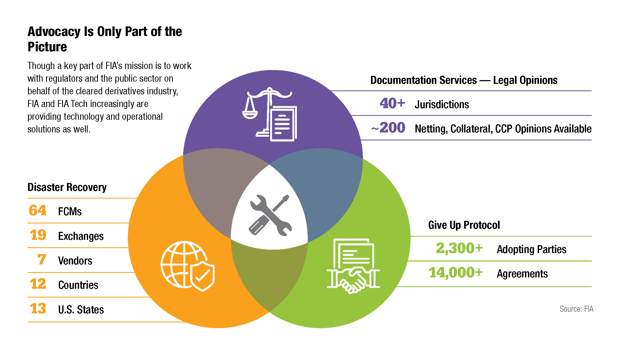 Much of FIA's work involves improving the efficiency and resilience of the markets through improved operations, best practice standards, enhanced technology and industry continuity exercises. In other words, FIA is a solutions organization with a growing toolbox at your disposal.