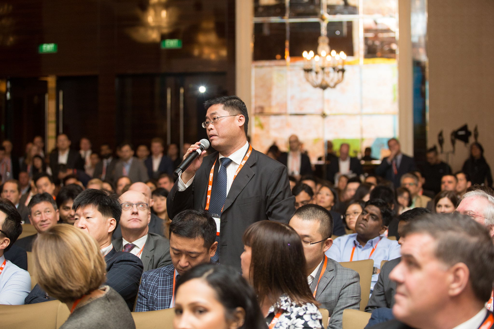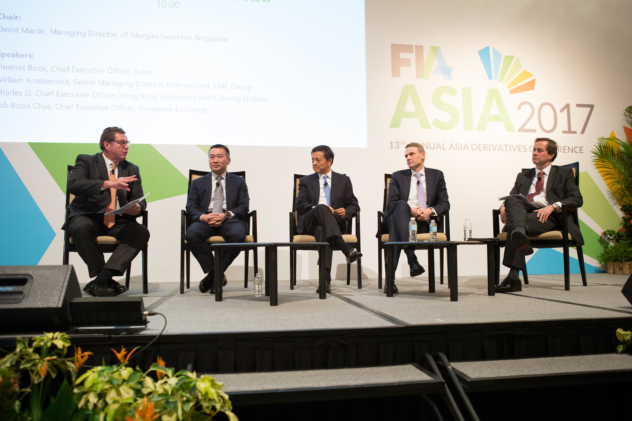 David Martin of J.P. Morgan leads a discussion on industry trends with exchange leaders Loh Boon Chye of SGX, Charles Li of HKEx, Thomas Book of Eurex and William Knottenbelt of CME.