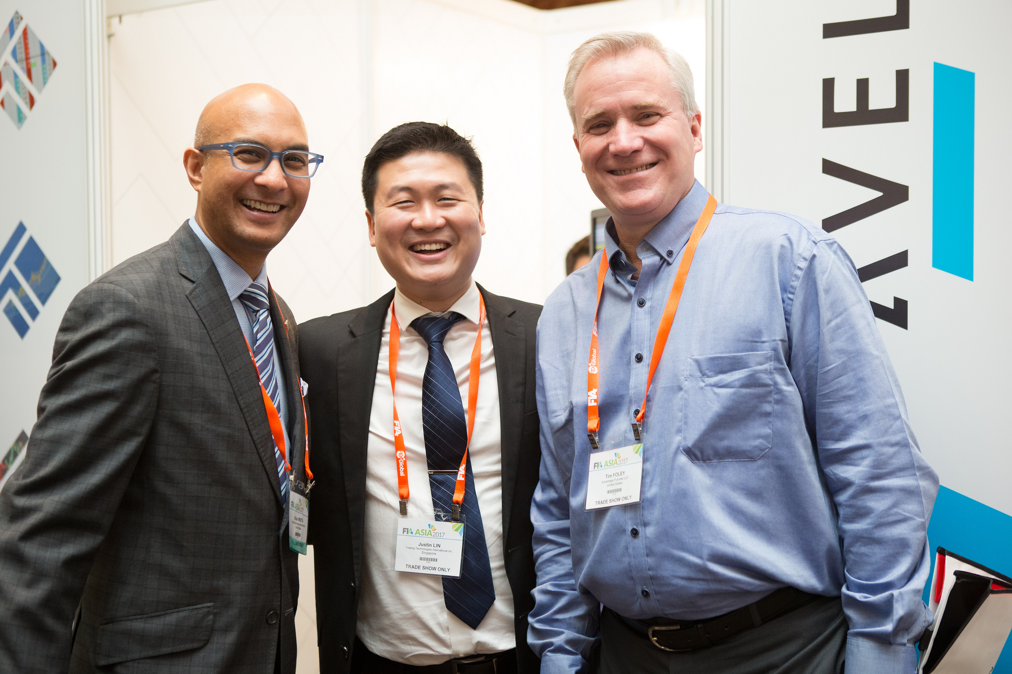 Trading Technologies' Brian Mehta and Justin Lin with Tim Foley of Advantage Futures.