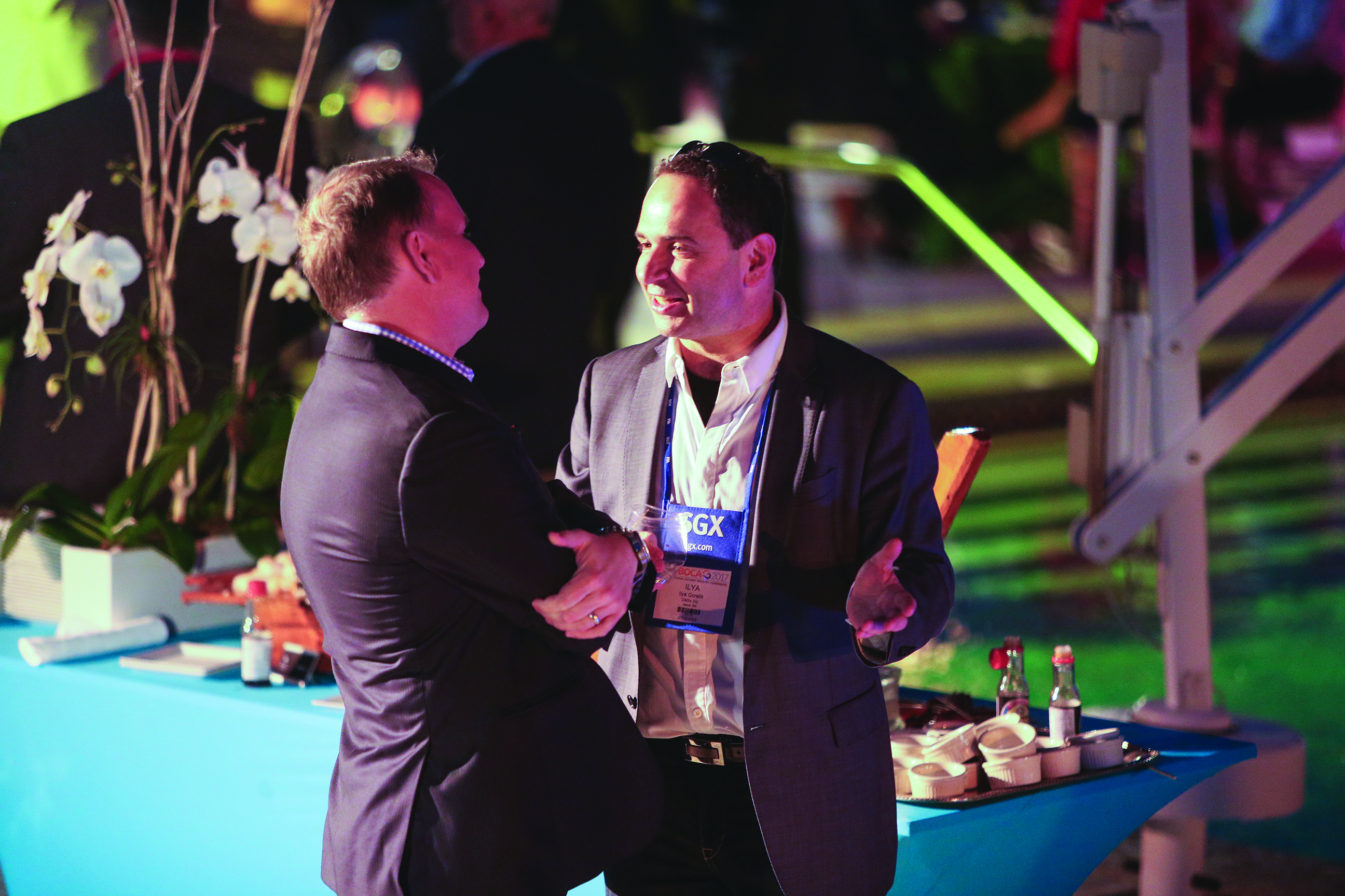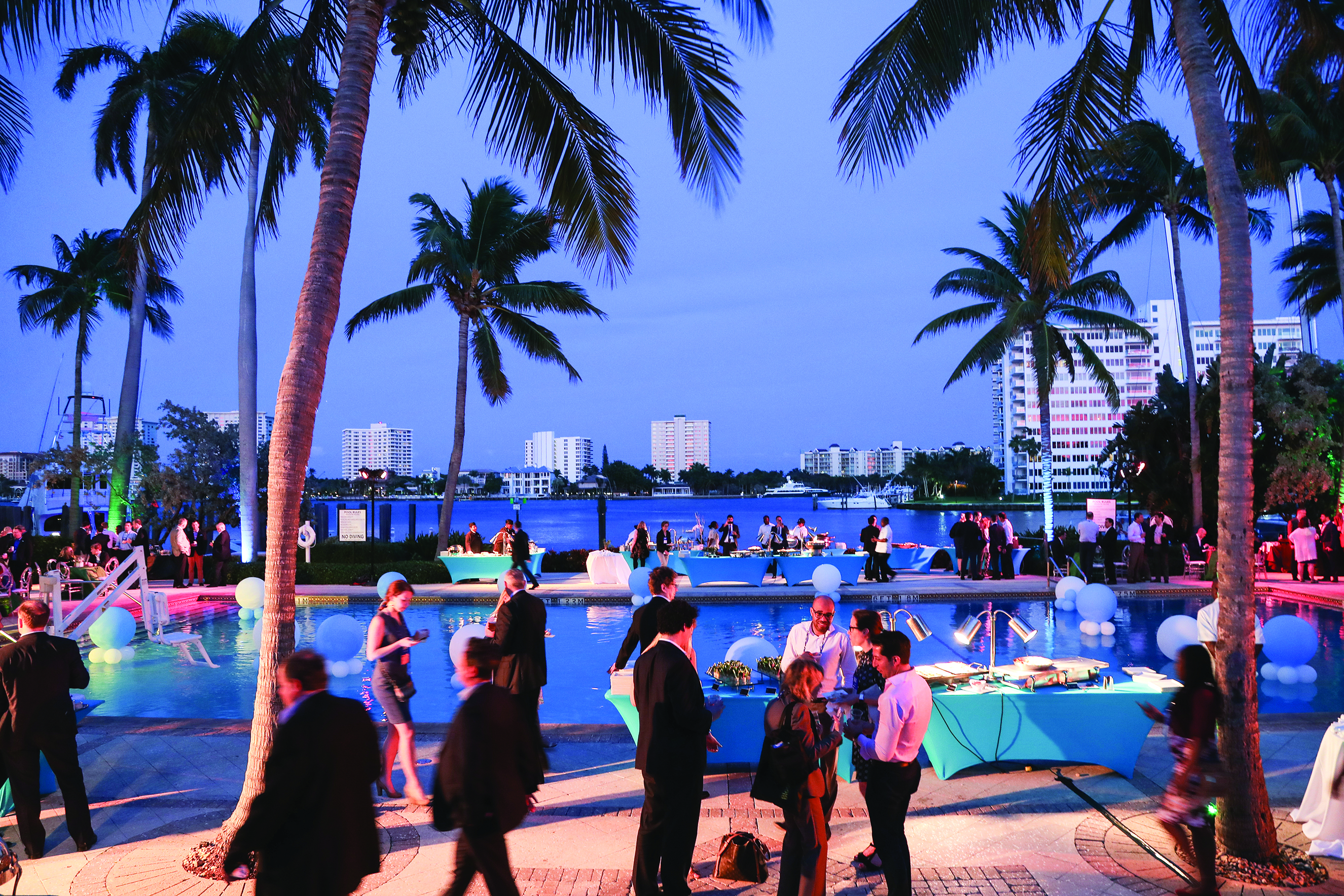 Attendees network at a poolside reception on the opening day.
