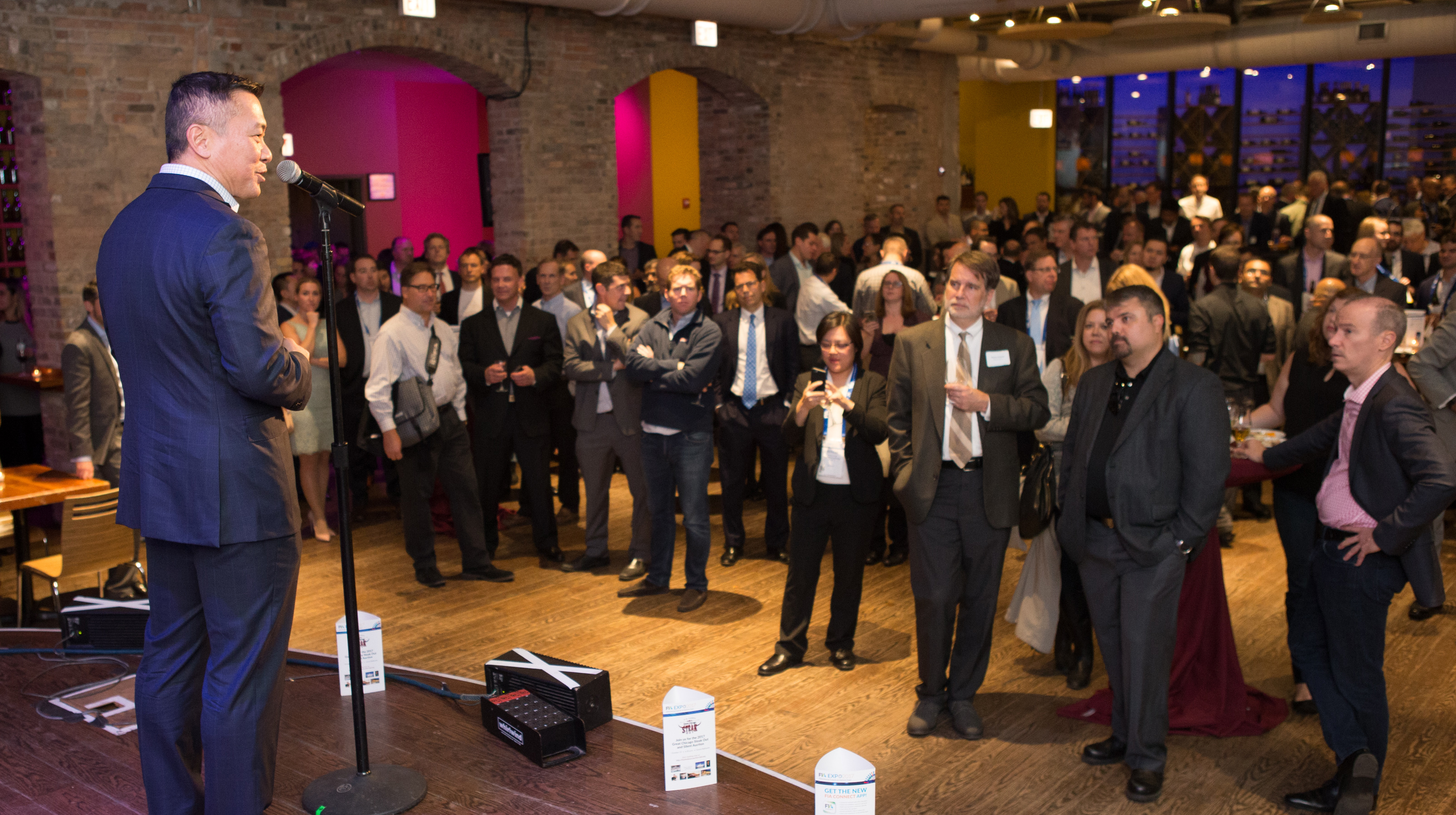 Loh Boon Chye of Singapore Exchange addresses the crowd at the FIA Expo opening reception.