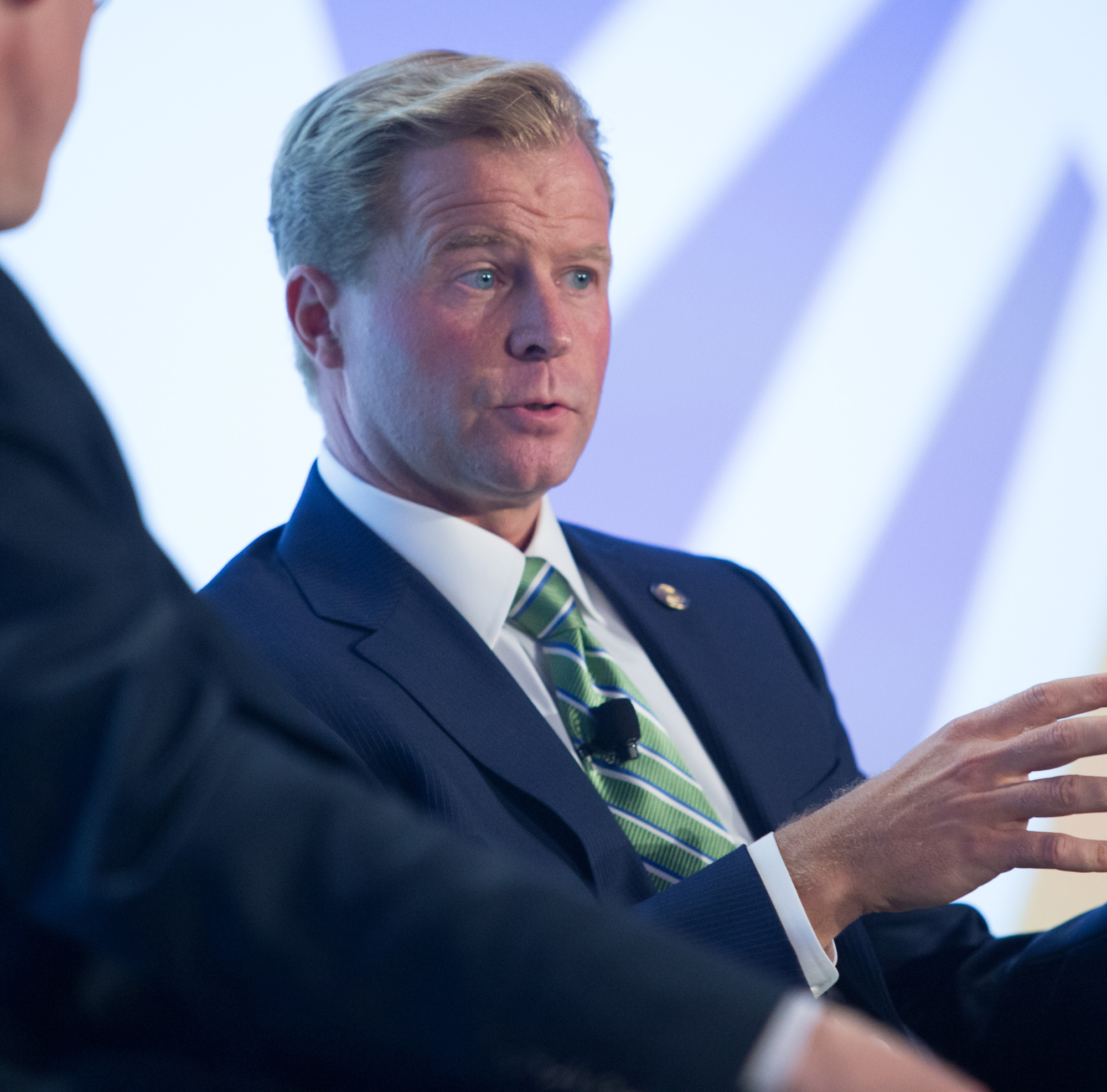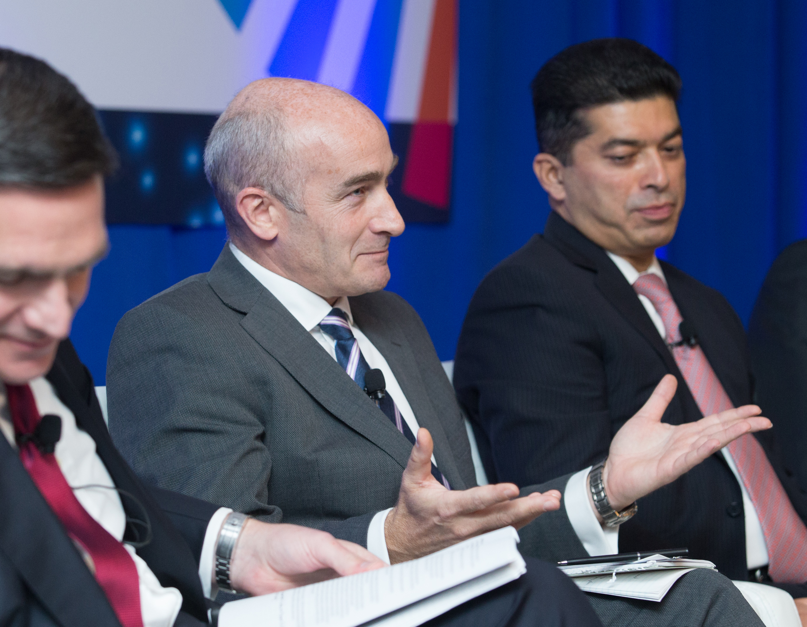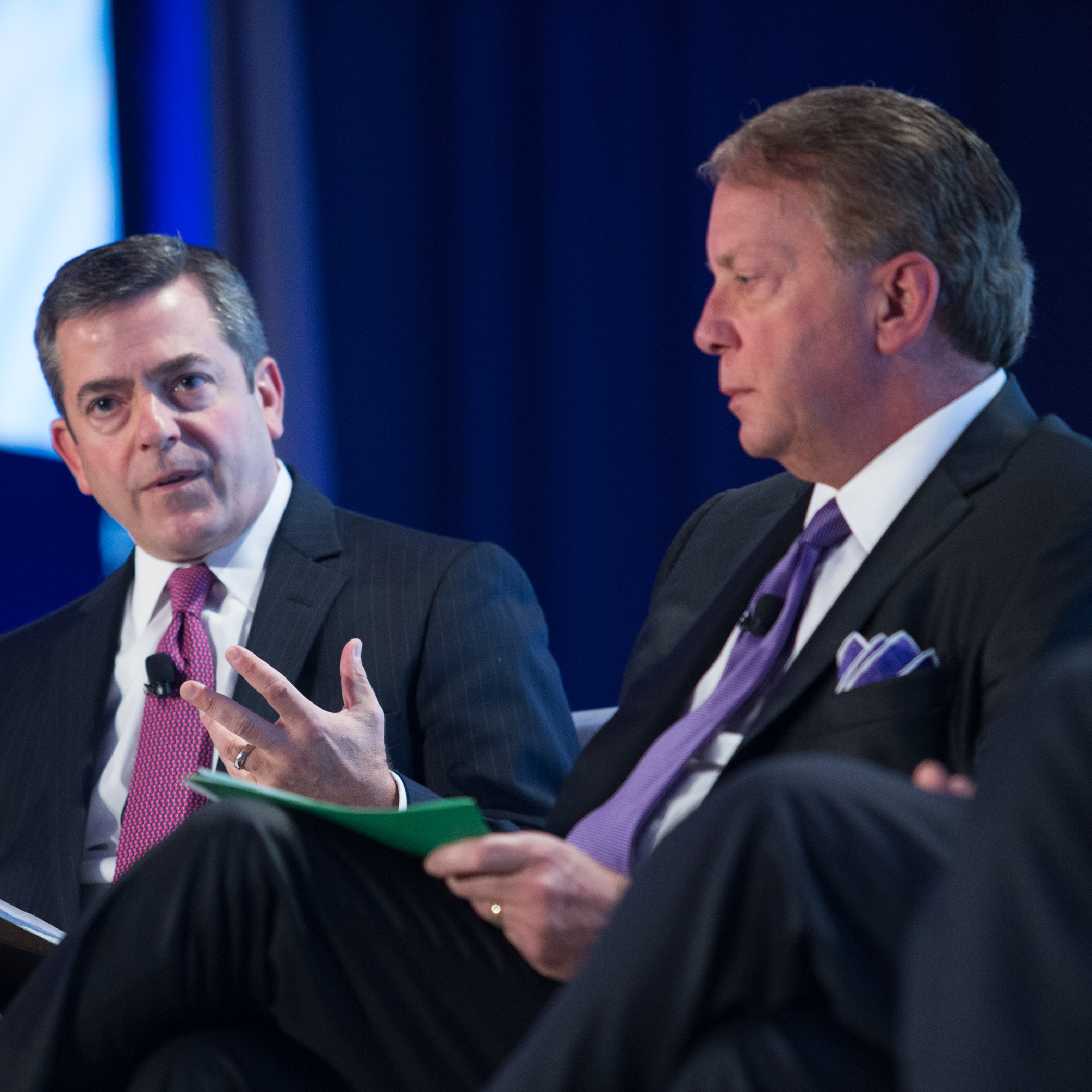 Terry Duffy of CME listens as Ed Pla of UBS moderates the exchange leaders panel.