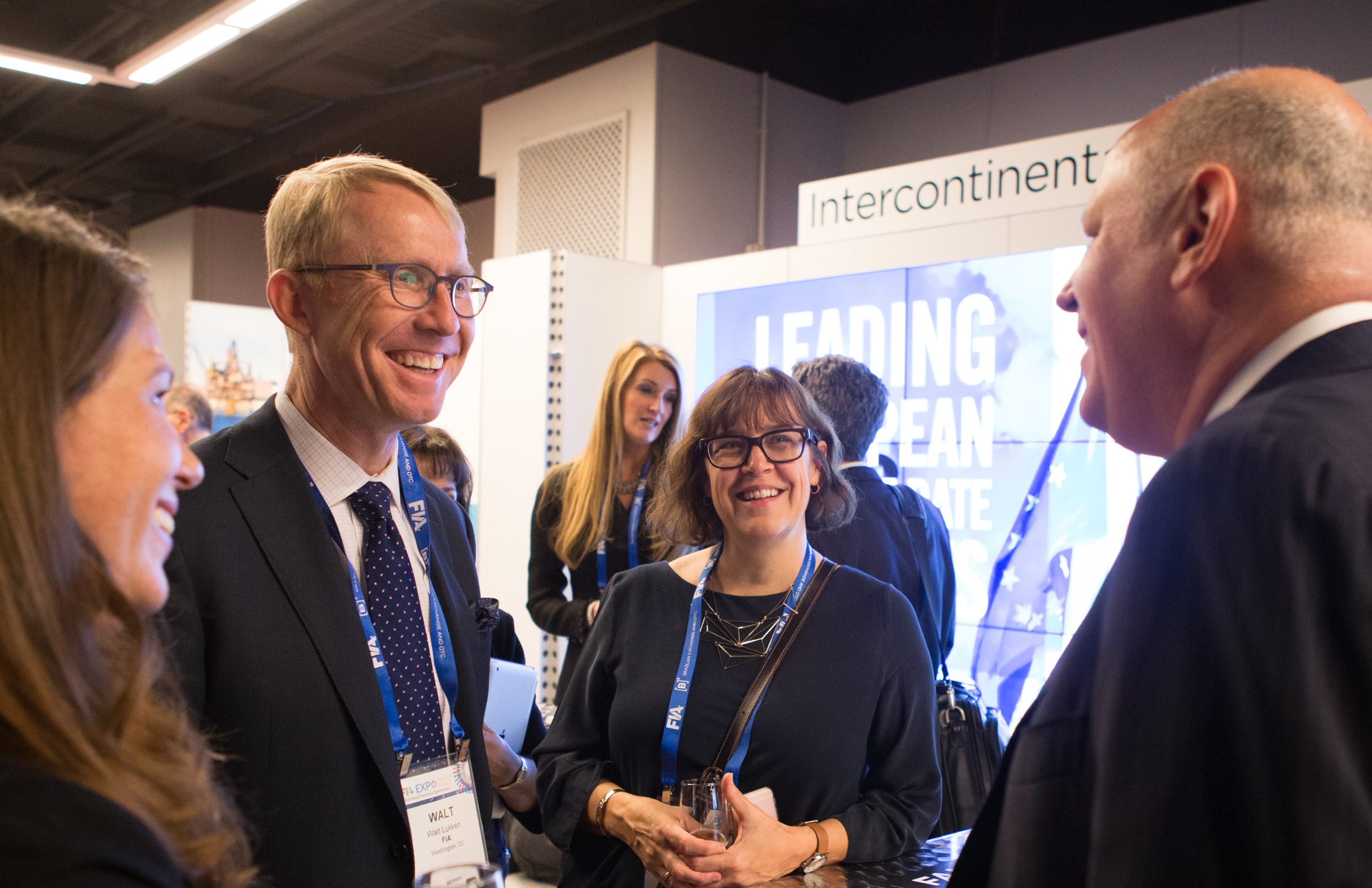 FIA's Walt Lukken talks with ICE CEO Jeff Sprecher at the ICE booth on the Expo show floor.