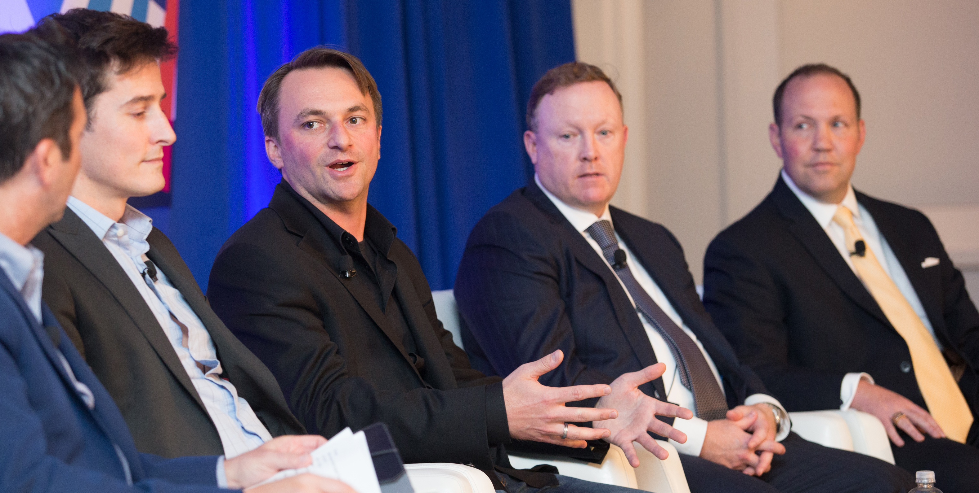 DRW's Don Wilson (left) moderates a discussion on the cryptocurrency market.
