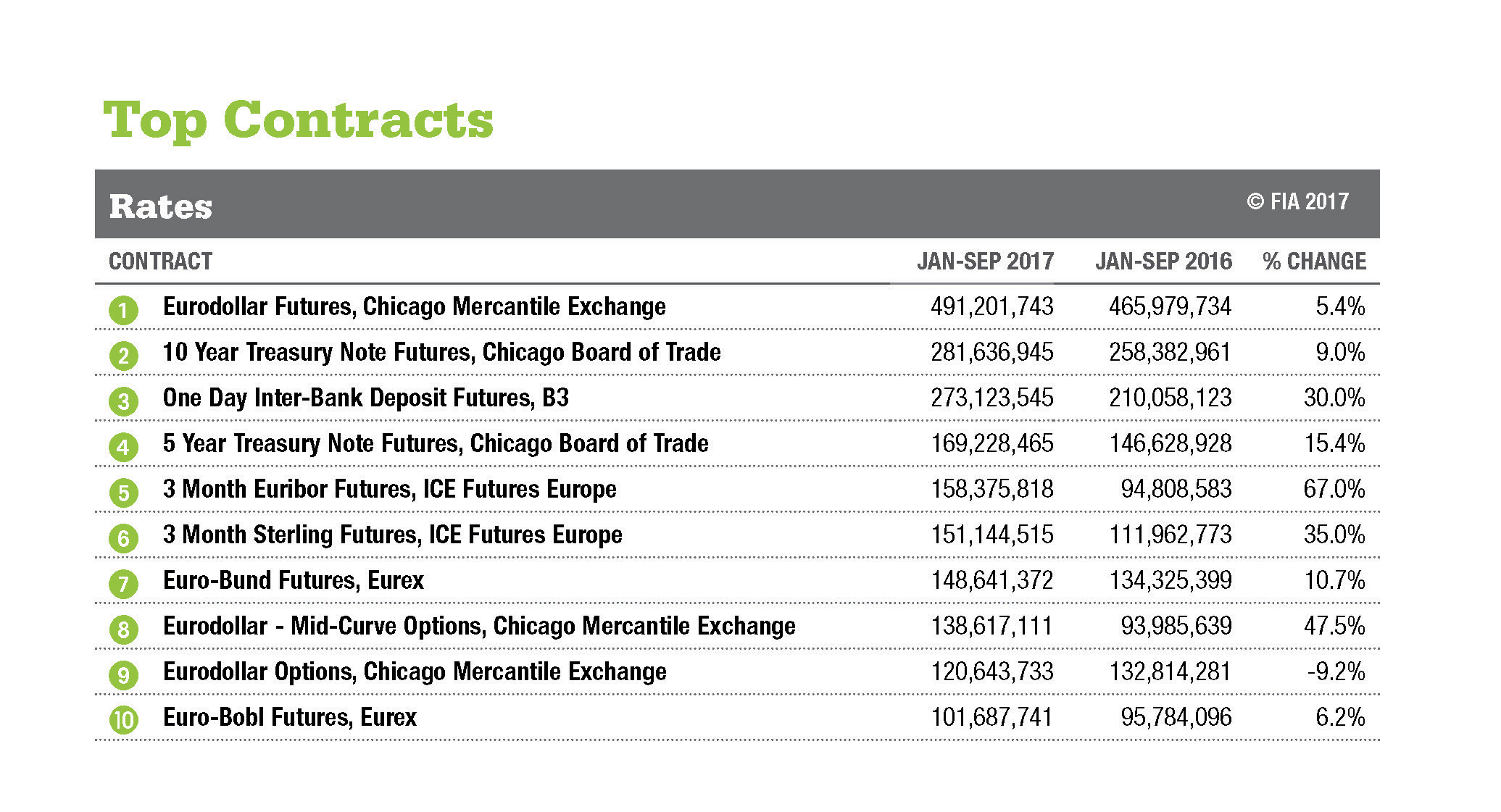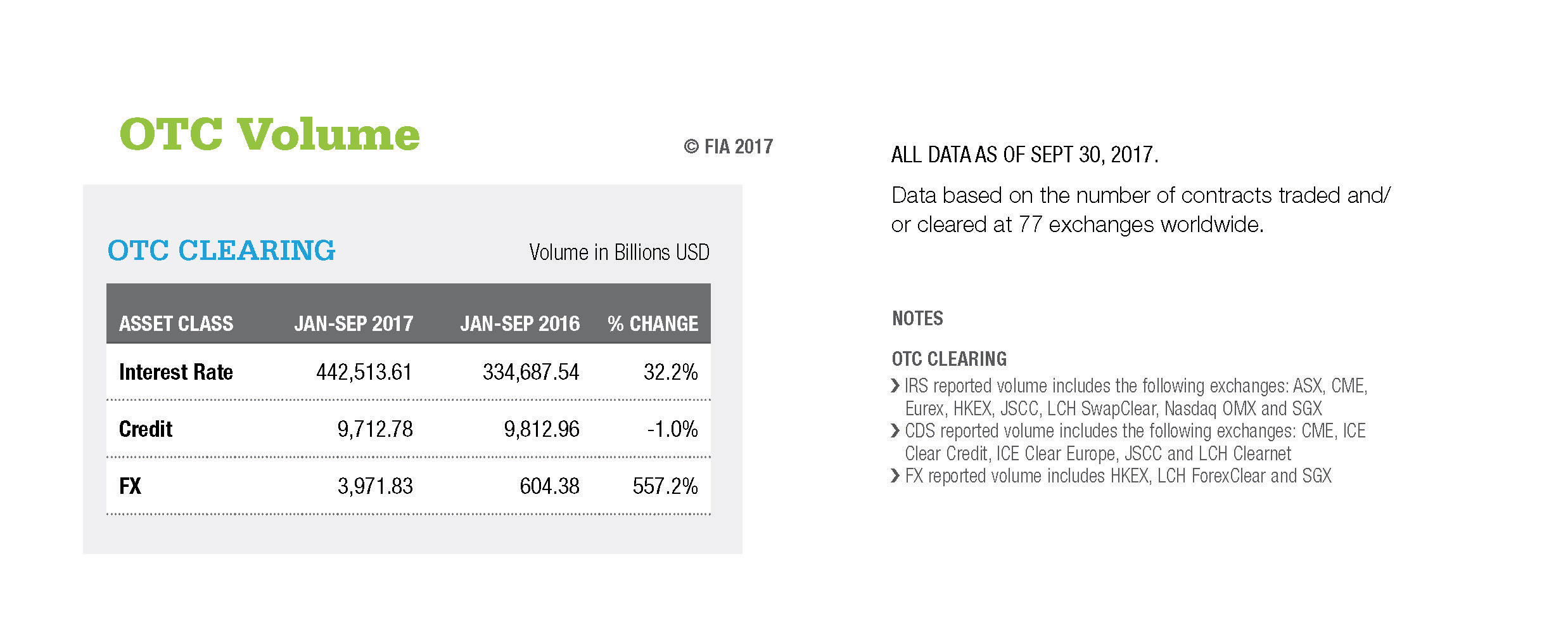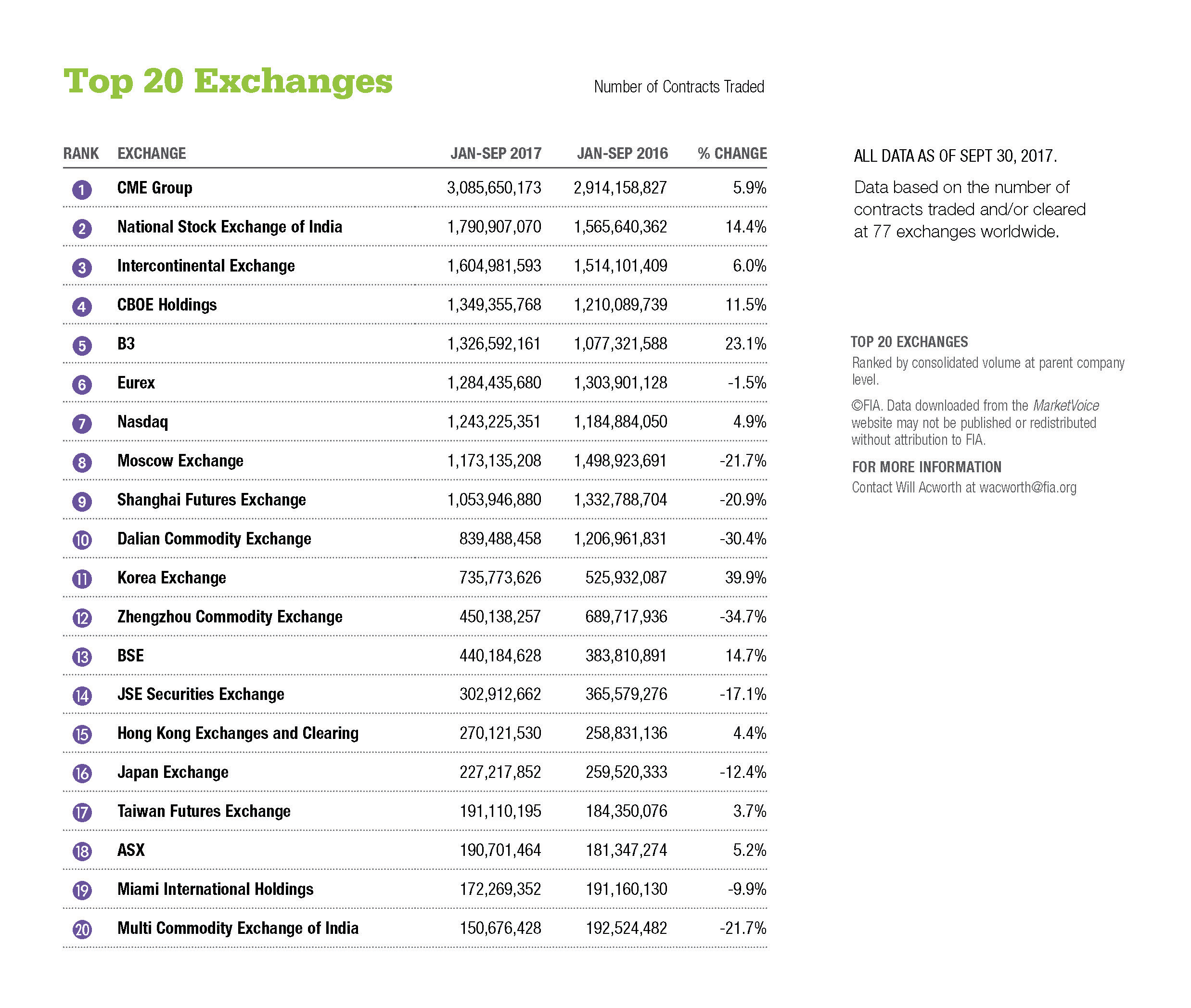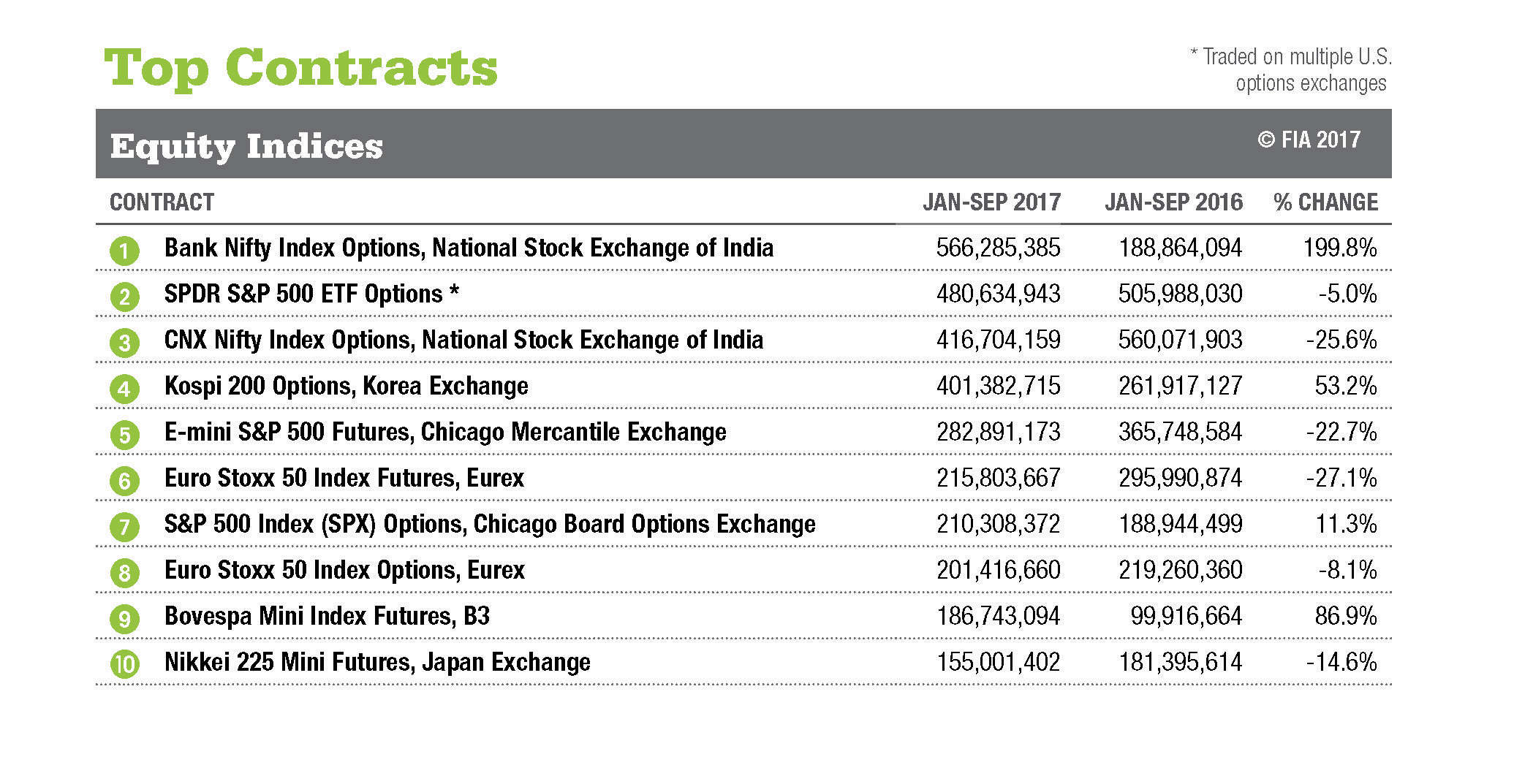 ALL DATA AS OF SEPT 30, 2017. Data based on the number of contracts traded and/or cleared at 77 exchanges worldwide.